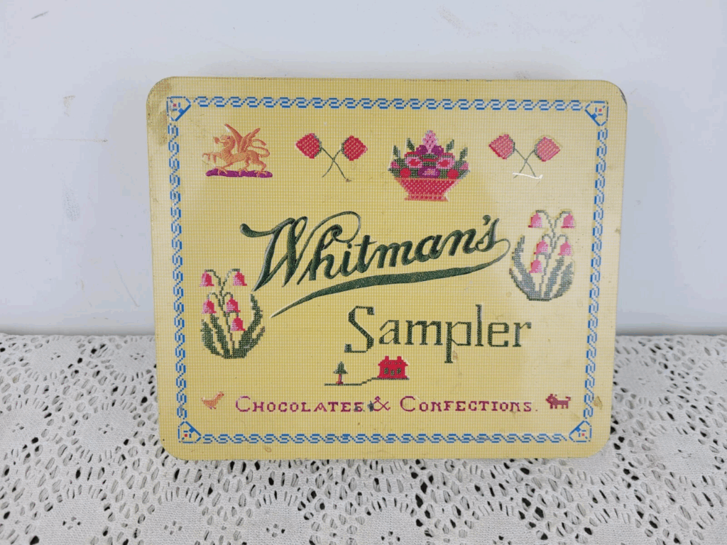 Back in the early 1930s Whitman’s produced a metal-tin version of their Sampler box which featured the signature stitched sampler motif on the lid. The standout feature is the original pressed tin box with the art of a home-style sampler design rather than just cardboard, making it a desirable piece of packaging history. Because metal tins survive better and fewer of them remain in good condition, these boxes fetch higher prices than the candy they once held. Today a clean tin might sell for around US$200 to US$400 depending on condition and completeness. Collectors value those with original paint finish and no major rust or damage.