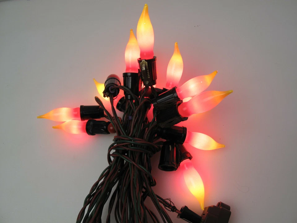 In many homes during the 1950s, NOMA sold C7 strings with flame-shaped bulbs for indoor or outdoor decorating. The warm look comes from the flame silhouette and the slightly old-tinted glass. A common market estimate for a boxed set that works is around $40 to $70. You will see them listed as Mazda bulbs in some vintage packaging. They still feel charming because they look like the lights people remember on porch lines and roof edges.
