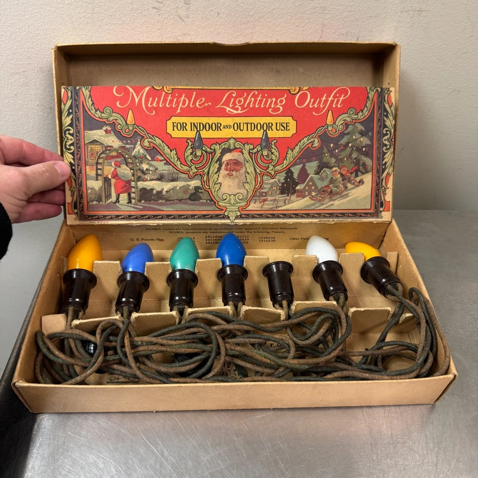 Outdoor C9 sets became more common in the 1950s as holiday lights spread beyond the tree and into yards and rooftops. NOMA sold heavy-duty looking sets, and many included classic components like flashers. The charm comes from the bigger bulb look and the sturdy, old-style sockets. A realistic market estimate for a complete working set is around $30 to $75, with higher prices for cleaner boxes. Many collectors keep these as display pieces because older cords can carry risk when plugged in.