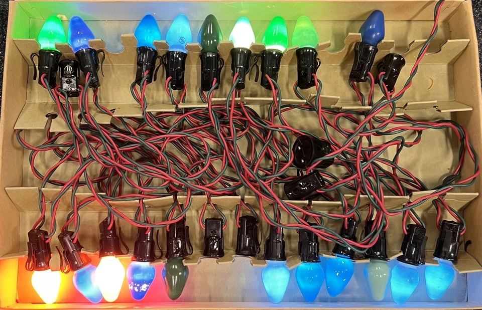 From the 1930s to 1940s, Paramount sold C9 strings with Bakelite sockets and flame swirl bulbs. The Bakelite parts alone give the set a heavy, old-time feel that collectors love. A typical current market estimate for a set with the box is around $30 to $60. What makes it special is the combination of chunky plugs and the flame swirl bulb shape. It feels like something you would see in a mid-century window display.