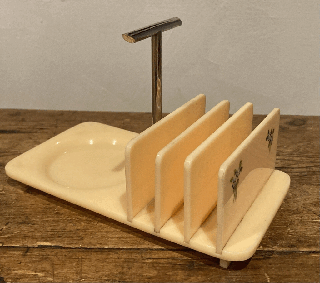 This toast rack was both a practical tool for storing toast and a decorative item in the kitchen. The chrome base provided durability, while the Bakelite handles added a pop of color and style. The rack’s design embodies the glamour of the Art Deco period, making it a desirable collectible. Many collectors appreciate the quality and craftsmanship that went into creating these vintage racks. They are often sought after for their nostalgic appeal and their ability to enhance a collection of mid-century kitchen gadgets.