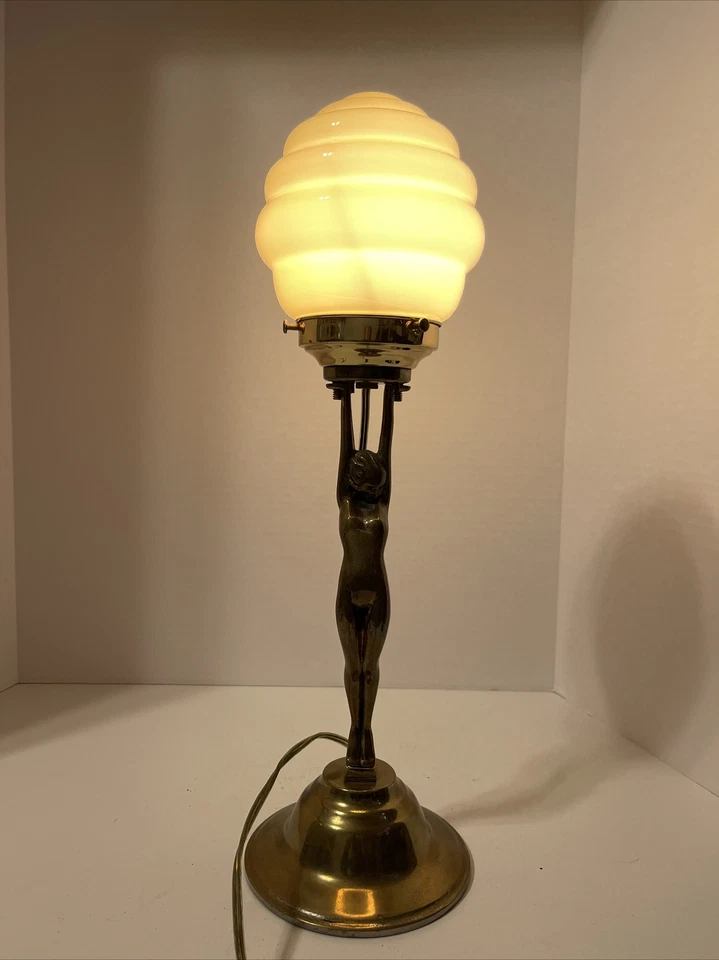 Produced in the 1930s, this lamp features a sculptural chrome base with a graceful lady figure. The green glass shade offers a vibrant and dramatic contrast to the chrome, adding color and elegance. Standing at 22 inches tall, it’s a perfect blend of function and art. Priced around $1,000, it’s a collector’s item that combines both beauty and utility. This lamp is a fine example of the period’s artistic flair and craftsmanship.