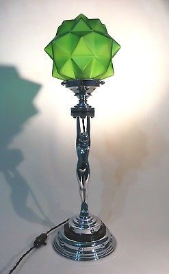 What makes this lamp so special is its artistic design, with the female figure being a prominent feature of many Art Deco lamps. The chrome base and green glass shade work in harmony to create an eye-catching design. The use of chrome gives it a modern feel, while the glass shade provides a warm, inviting glow. Its standing height makes it ideal for a statement piece in a room. Collectors seek it for its rarity and the iconic figure that symbolizes the Art Deco style.