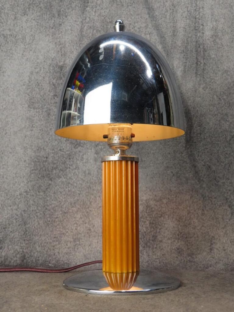 Streamline Art Deco Chrome and Butterscotch Catalin Lamp