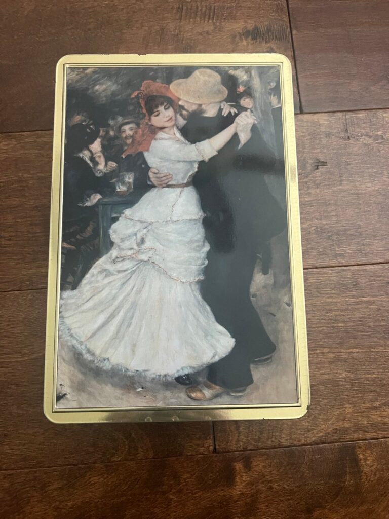 The Stollwerck chocolate tin from 1928 was created for German chocolates and features beautiful artwork depicting dancers and flowers. Its elaborate design makes it a collectible treasure. A tin in good condition can be worth anywhere from $70 to $120. Its square shape makes it an ideal gift box for small items such as jewelry, cookies, or candies. The sturdy metal ensures that it can be used and displayed for many years.