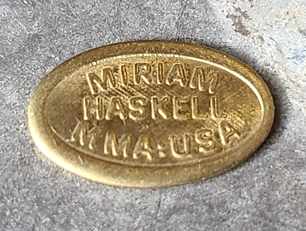 Miriam Haskell marks are often on a small oval tag that may be wired onto the piece rather than stamped directly into metal. Many older items are unmarked, so a tag is helpful but not required for a real Haskell piece. Haskell jewelry often uses pearls, glass beads, filigree, and hand wired construction that looks busy in a beautiful way. The backs can look like a tiny woven garden of wire, and that texture can be a big clue.