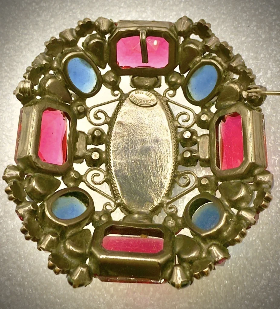Schreiner marks can be tricky because many pieces are unsigned, but when marked you may see SCHREINER or Schreiner New York. Collectors love Schreiner for its unusual stone settings and bold, layered construction. A common clue is the use of inverted stones, where a rhinestone is set with the point facing outward instead of the flat side. You might also notice extra sturdy metalwork and a lot of depth in the design.