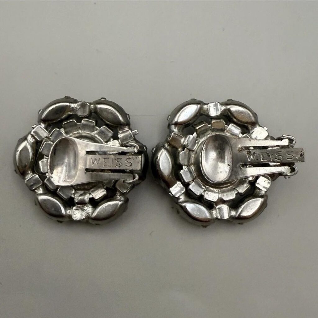 Weiss marks usually read WEISS in all caps, and they are often stamped right on the back of a brooch or earring clip. Weiss is strongly linked with rhinestone work, and the sparkle can be impressive when stones are clean and present. Many pieces use bright clear stones, deep colored navettes, or layered flower designs that photograph well. If the stone colors look lively and the settings feel tight, that is what you want.