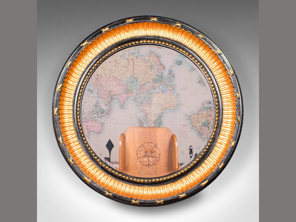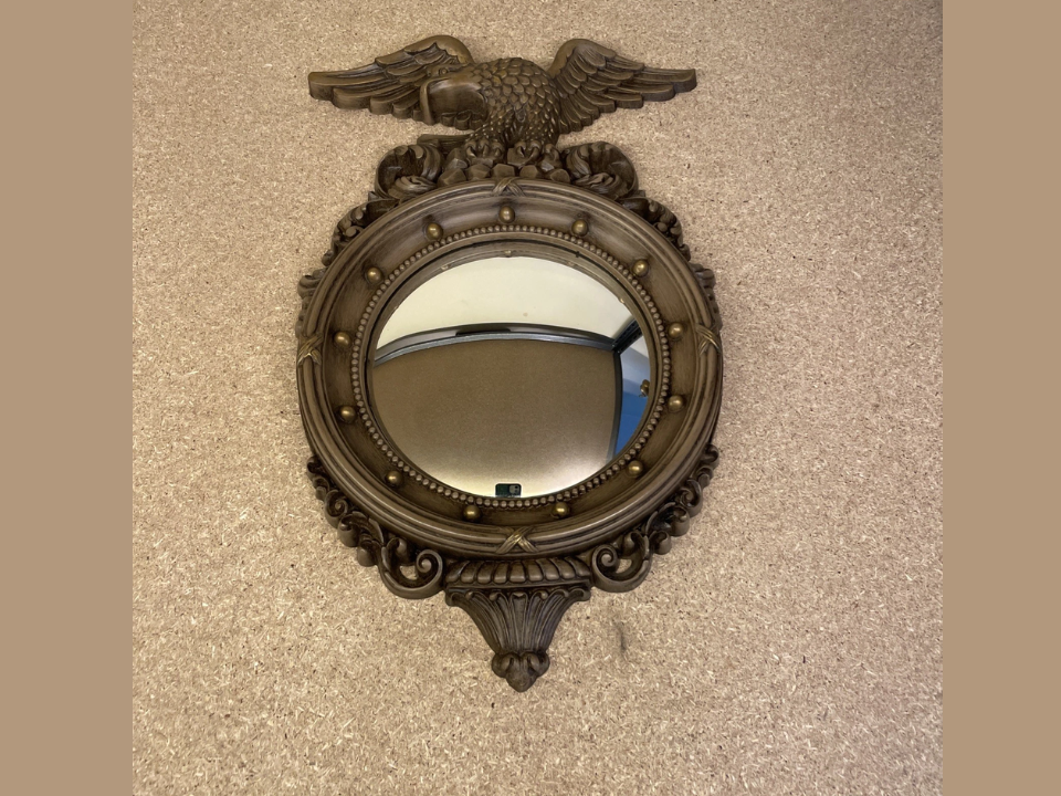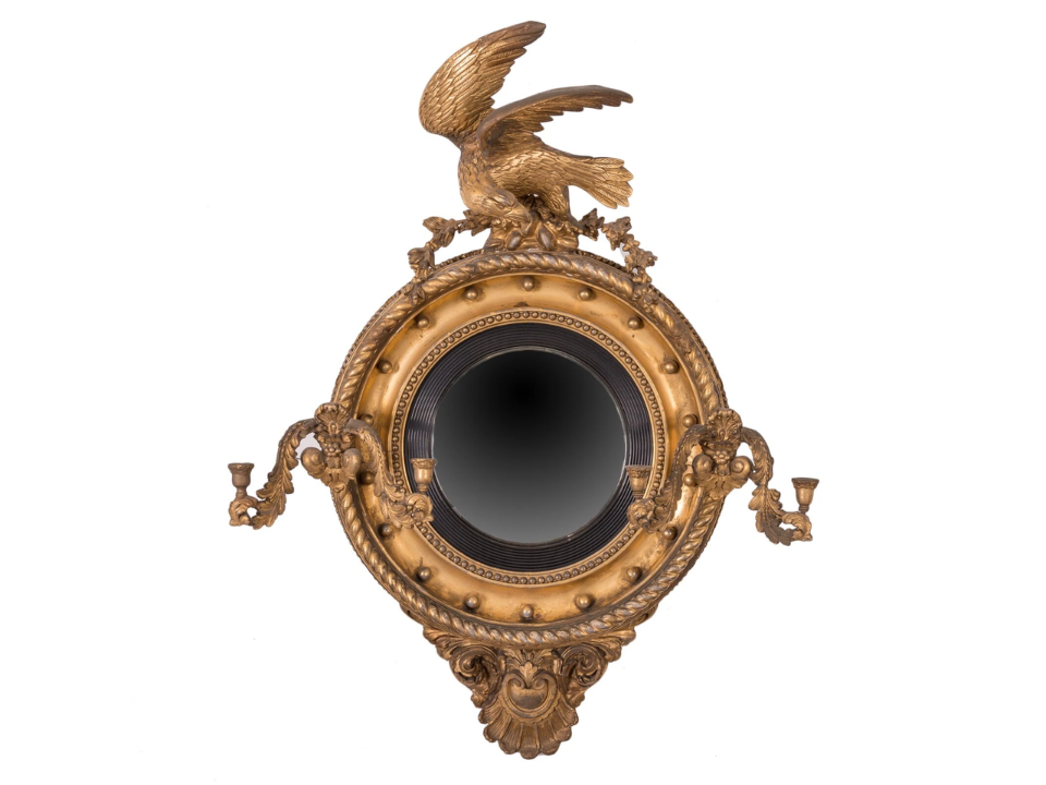 This mirror, dating back to circa 1820, features a giltwood and ebonized frame adorned with an eagle crest. Its convex shape, often referred to as a “bull’s-eye,” offers a wide, distorted reflection, characteristic of the period’s design. The eagle crest atop the frame adds a touch of grandeur, reflecting the neoclassical influences prevalent during the Regency era.