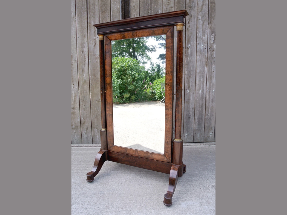 A Regency cheval mirror is a full-length, free-standing mirror supported by a wooden frame that allows it to tilt. Originally designed for dressing rooms, it was both practical and ornamental. The frames often feature elegant carvings, turned legs, and gilt embellishments, reflecting the sophistication of the period.