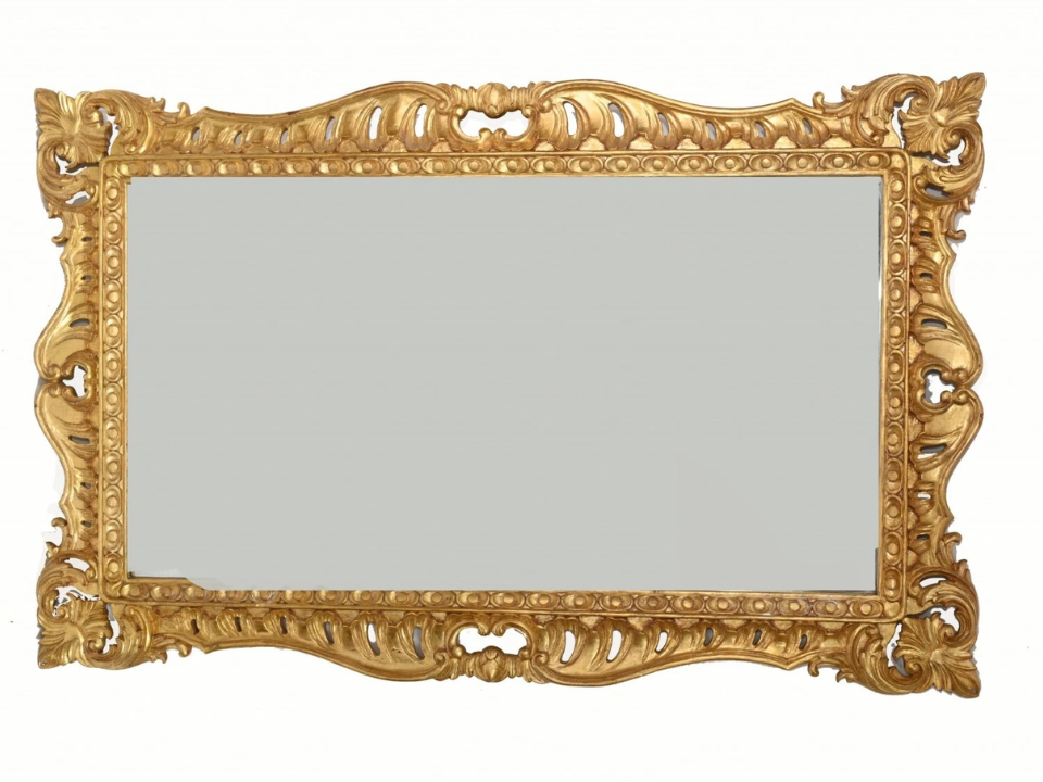 A fine example from the early 19th century, this overmantel mirror showcases a gilded wood frame with intricate carvings. The design is typical of the Regency period, emphasizing symmetry and classical motifs. Its size and ornate frame make it a striking piece above a fireplace or in a grand hallway.