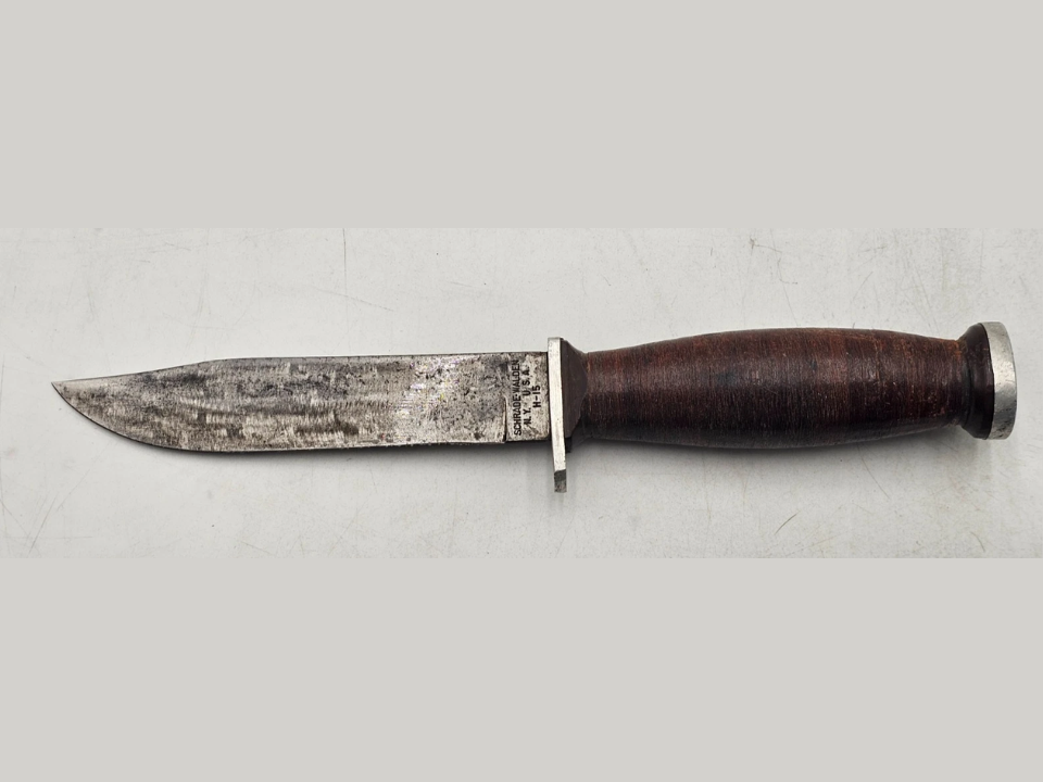 The Schrade Walden H-15 is a fixed-blade hunting knife produced between 1958 and 1973. Its 6-inch blade and stacked leather handle make it a durable choice for fieldwork. The full tang construction ensures strength and longevity.