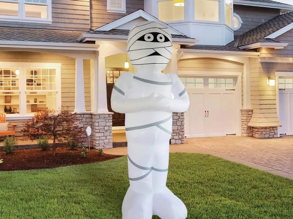 The inflatable mummy became a popular figure for Halloween displays in the 2000s. This inflatable typically depicted a wrapped mummy emerging from the ground or hanging in midair with glowing eyes. The design often included spooky details like tattered bandages and a glowing or fogging effect, making it stand out in a front yard.