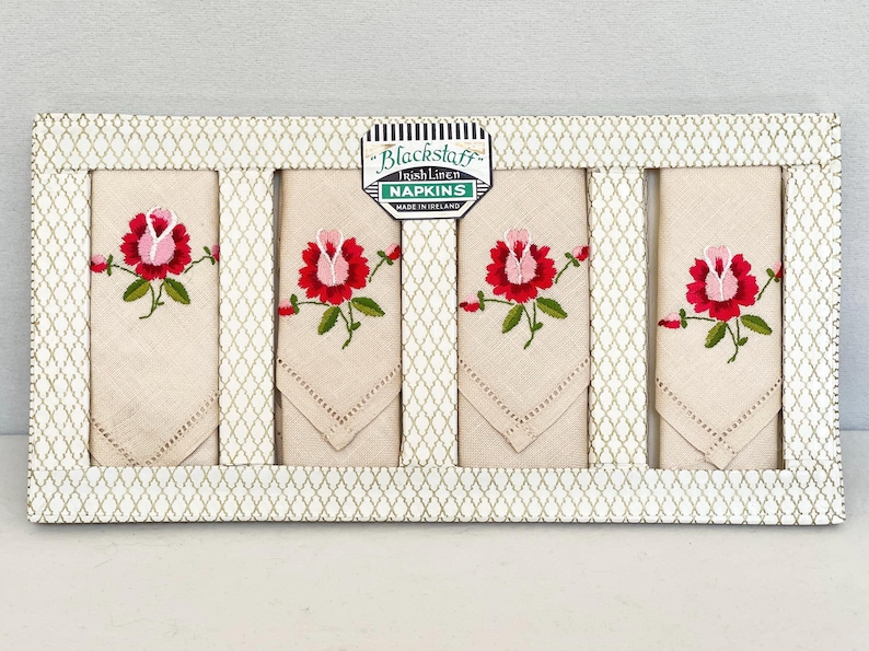Blackstaff Irish Linen napkins have a classic look that many vintage linen buyers still enjoy. A boxed floral set like this was likely made around the 1960s. The embroidered blooms on natural linen give the napkins a clean but warm appearance. A set of four usually sells for about $29 to $32.