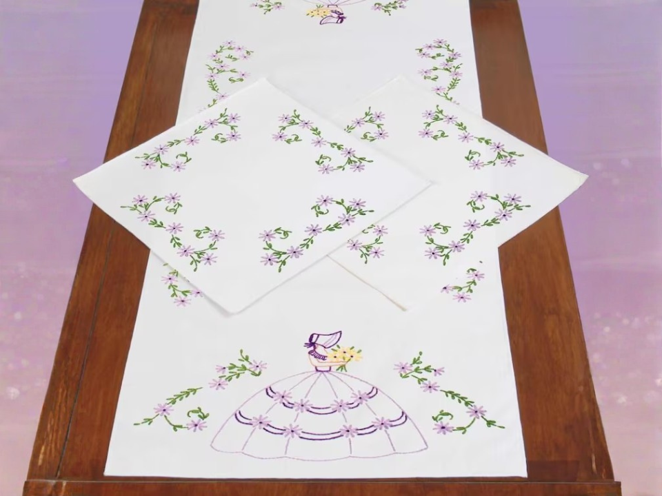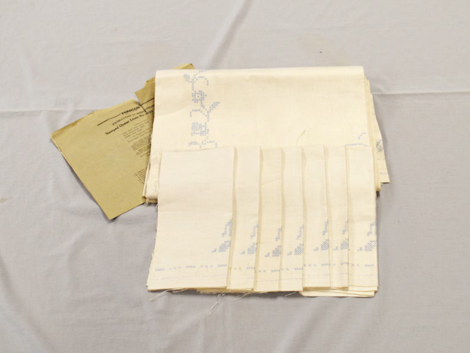The attraction here comes from both the design history and the full set format. Many people like seeing how floral table linens were planned for home use in earlier decades. Even when the set is unfinished, the printed layout and matching pieces still make it interesting to own. A complete group often feels much more satisfying than one stamped cloth by itself.