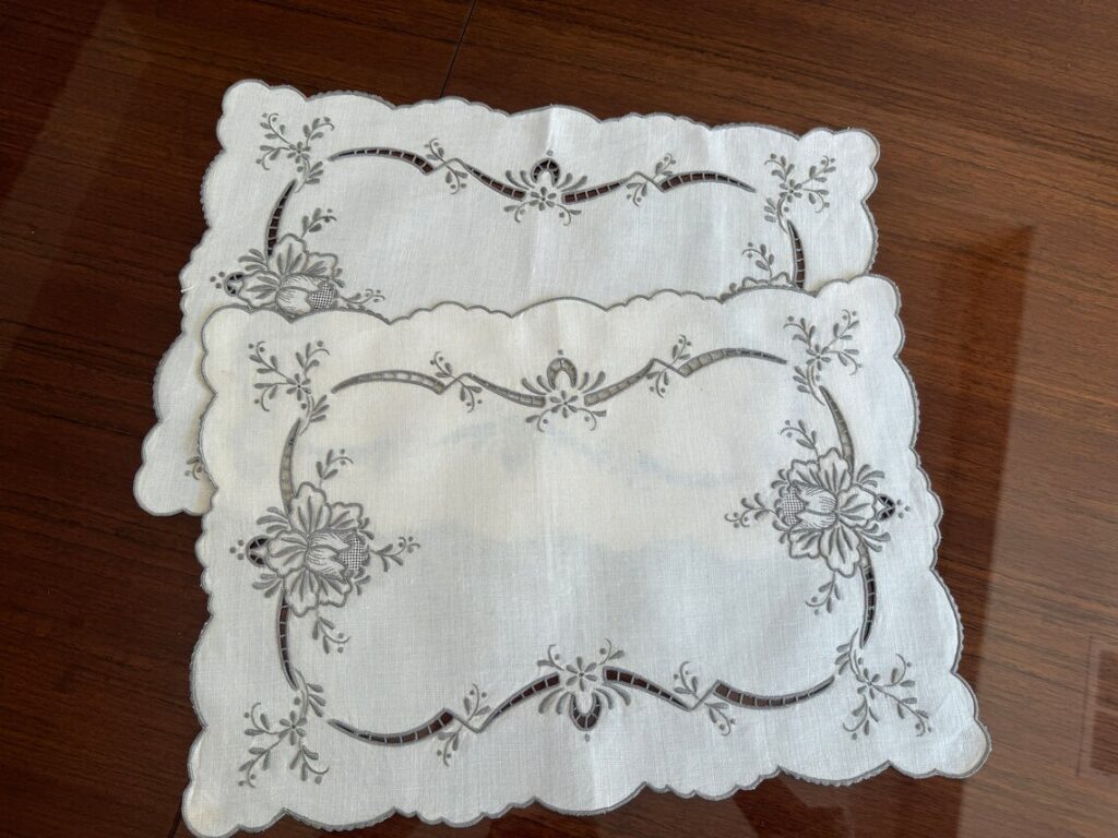 Madeira orchid cutwork placemats are often noticed for their quiet elegance and their carefully worked floral design. A pair like this was commonly made around 1945. The orchid motif, cutwork details, and scalloped finish give them a formal but gentle look. Today, a pair in nice condition is often worth about $20 to $25.