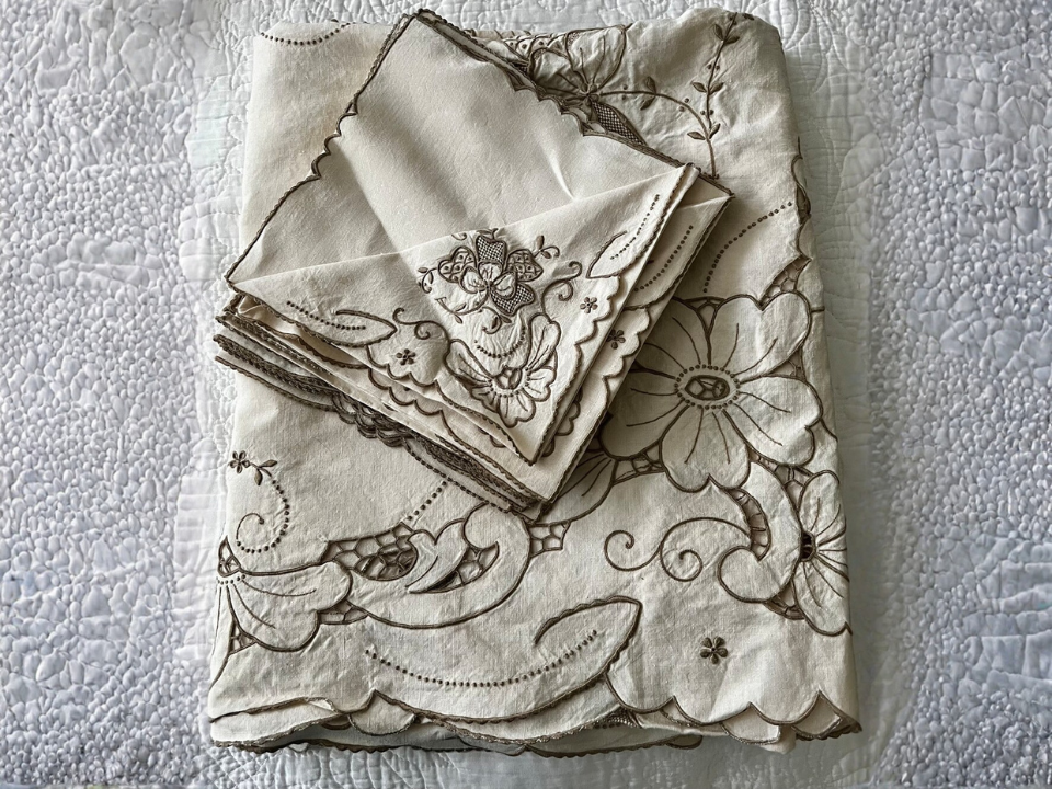 Madeira Portugal tablecloth sets remain popular because the floral embroidery looks graceful and richly detailed without feeling too busy. This kind of set was often produced around the 1960s, which gives it a strong mid-century appeal. The handworked flowers, cutwork, and scalloped edges make it stand out from plain formal linens. A set in good condition usually sells for about $130 to $145 today.
