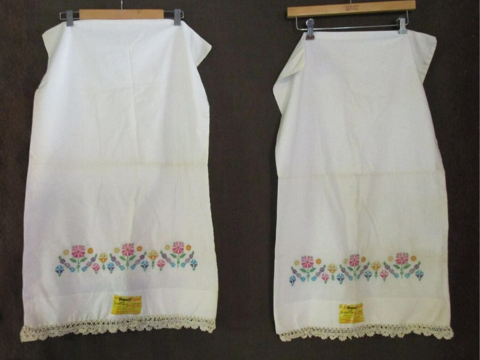 Vogart floral pillowcases are remembered by many people who grew up around home embroidery and stamped transfers. A finished pair like this was likely made around the 1950s. The floral embroidery gives the cases a gentle and familiar look that still feels easy to use today. Most pairs sell in the range of $15 to $20.
