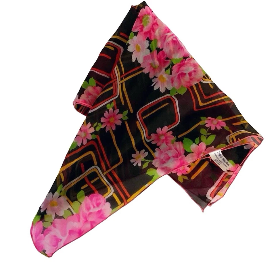 This scarf is a great example of how synthetic fabrics were integrated into high-end accessories in the 1960s. The softness of chiffon combined with the durability of nylon made it an attractive option for scarves during the era. Vintage scarves like this one are highly collectible due to their rarity and the fine balance between function and style they offer. A scarf in pristine condition with vibrant colors will always command a higher price in the market. Proper storage is important to avoid fabric distortion or discoloration.