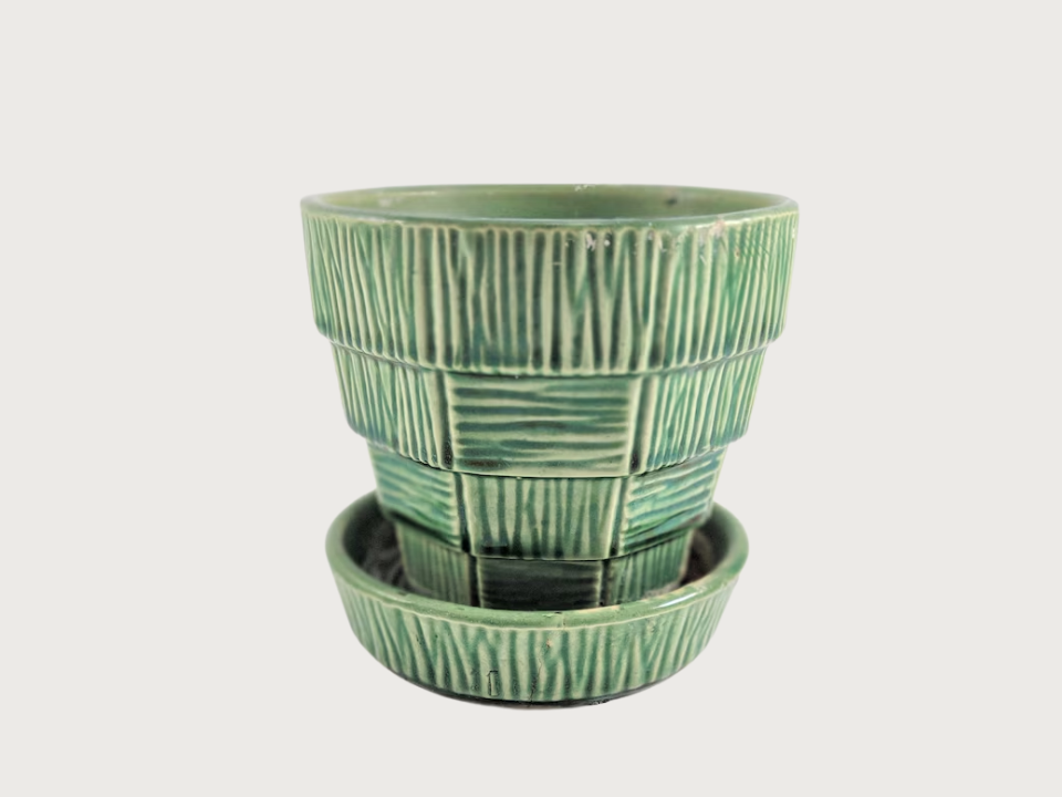 A McCoy Basketweave flower pot has a warm and homey look that feels just right for spring. This piece was produced in 1950, and it is made of ceramic pottery with a woven pattern around the body, with a current price of $30. People like collecting it because the texture gives it more charm than a plain round pot.