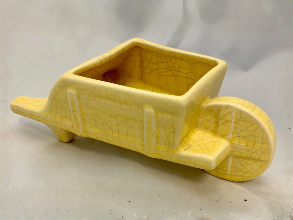Because it is compact, it works well on porch tables, narrow shelves, or tucked beside other planters. The wheelbarrow form has a cottage garden feel that suits spring decorating nicely. McCoy novelty pieces also tend to feel friendly rather than too formal. That gives this one a nice place in a mixed planter collection.
