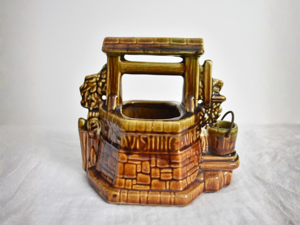 With its playful shape, the McCoy Wishing Well planter brings a lighter mood to a porch shelf. This planter was produced in the 1950s, and it is made of ceramic pottery in a novelty well form. Its current market value is about $13. People collect it because it feels cheerful and a little storybook without losing its old-fashioned look.