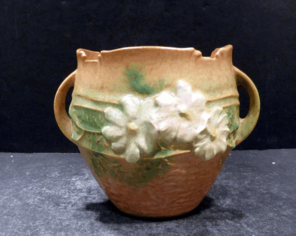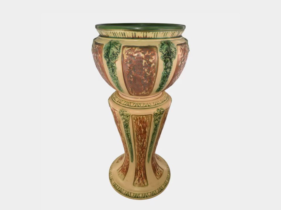 Set near a front step, a Roseville Florentine II jardiniere and pedestal has the kind of presence people remember. Roseville produced this line in 1933, and it was made from glazed art pottery with rich molded detail across the surface. Its current market value is about $850. People collect it for porch season because it looks grand even before a plant is added.