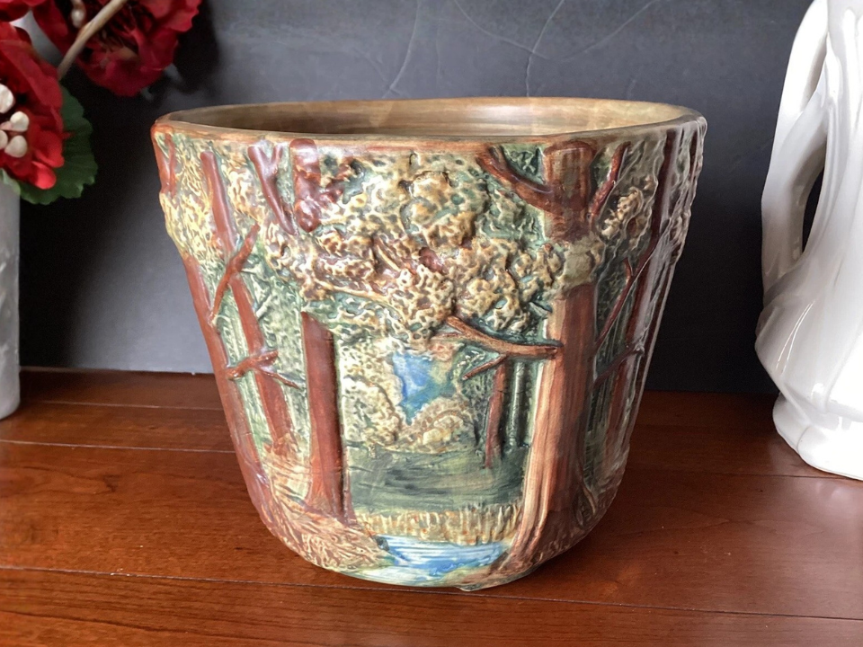 Earlier American pottery has a look all its own, and the Weller Woodcraft Forest planter shows why. This planter dates to 1920, and it is made of pottery with a matte green finish that feels quieter than shinier later pieces. Because of its age, people love to collect it. The finish gives it a more antique mood than most porch planters from the 1950s and 1960s. Its current market value is about $100.