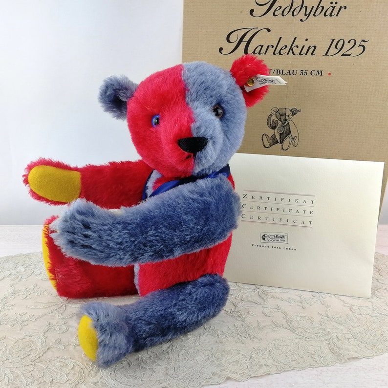 Introduced in 1925 by Steiff, this bear is recognised by its distinctive half-red, half-blue mohair design. Its collectible appeal comes from its age, the unusual coloration, and the brand’s reputation for quality materials and craftsmanship. Auction records suggest values in recent years around £45,000 (approximately $55,000-$60,000 USD or higher) for specimens in excellent condition. A collector should examine the mohair texture, the jointing of the limbs, and the ear button tag to judge authenticity. Condition is critical, as vintage mohair can deteriorate, and any replacement parts will reduce value.