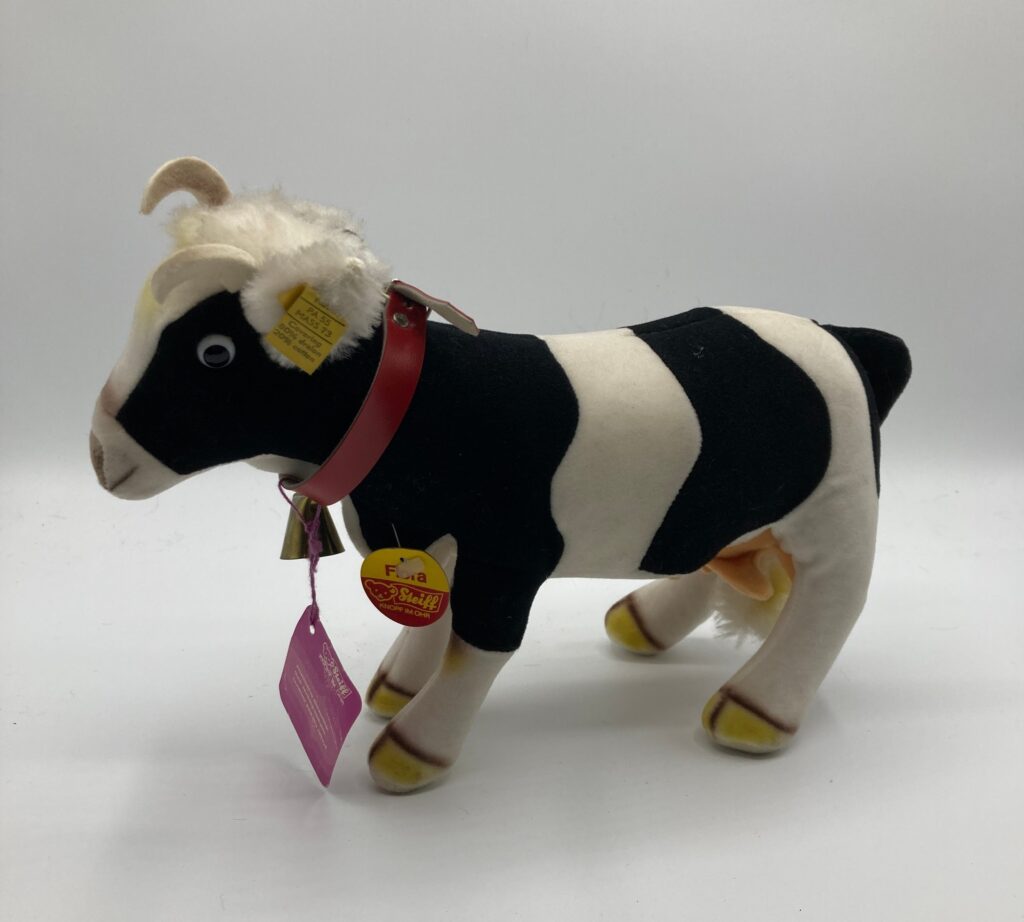 Produced by Steiff in Germany around 1978, the Flora cow plush in mohair with black and white colouring is an example of a collectible non-bear from a respected maker. Because non‐bear plush toys from major makers are less common, this adds a measure of rarity. Estimated market value for an item in very good condition is around $500 to $1,000 or more, depending on size, condition, original tag and documentation. A collector should check for original mohair fabric, tags, correct stitching, minimal wear and original condition. Condition and originality of the tag are especially important in determining value.