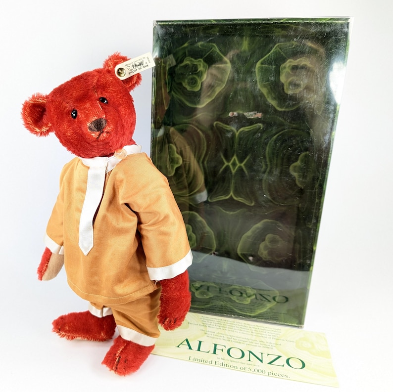 In 1990 Steiff released a limited edition bear named Alfonzo (among other replica offerings) which replicated earlier classic designs but in controlled quantities. The limited run and brand reputation make it collectible for those focusing on late-20th century plush. A typical market value might be in the range $500 to $2,000 depending on how many were produced, the edition number, condition and whether it includes box and certificate. Collectors will look for intact edition number tags, original box, certificate of authenticity and excellent condition. The presence of all original packaging and documentation adds significantly to value.