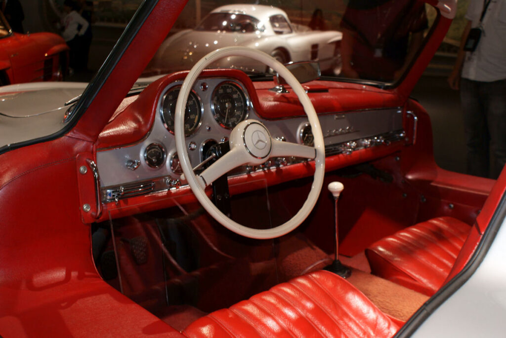 The 1955 Mercedes-Benz 300SL steering wheel was introduced with a car that became a legend for performance and style. Its elegant thin rim and classic hub reflect the refined design language of Mercedes-Benz. Original wheels in excellent condition can reach $2,000 to $3,000 in the collector parts market. Many restorers look for an exact match to the original paint and emblem. This wheel is often highlighted in displays of classic European automobiles.