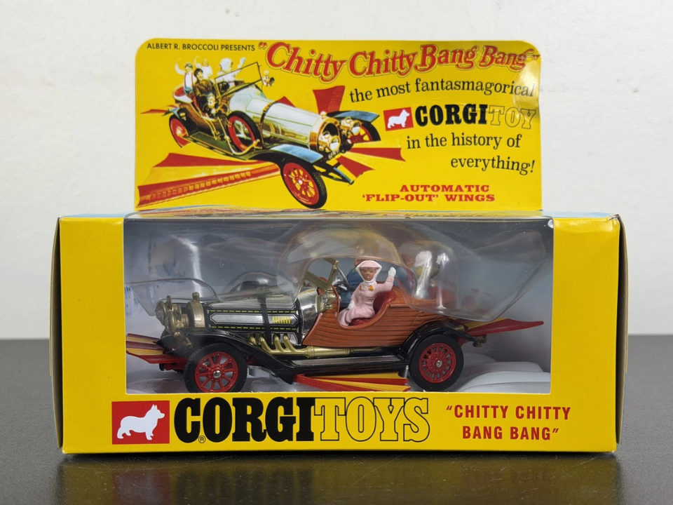 Collectors pay close attention to details like the gold strip on the radiator, wheel type, and whether the car sits in the larger early box with cloud backdrop. The first issue with gold windscreen trim and complete figure set is easily the most desirable combination. Boxes are vulnerable to torn cellophane and crushed corners, so clean packaging tells buyers that the car spent its life in safe hands. Dealer archives and auction results show first issue boxed Chitty models selling in the £400 to £440 bracket, or around $560, when condition is close to mint.