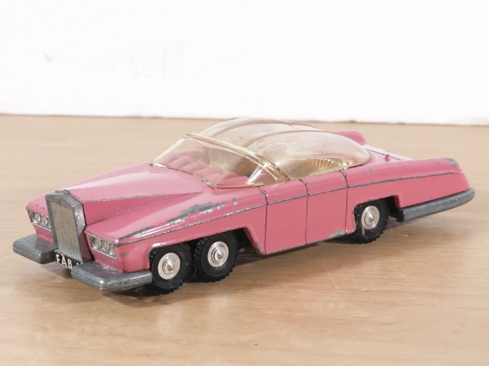 Lady Penelope’s FAB 1 Rolls Royce from Dinky Toys wraps British luxury and spy drama into one pink plastic and diecast package. Based on the stylish car from a puppet action show, the model includes clear fins, rockets under the front, and figures seated inside. Children loved firing the front rockets and rolling the car across carpets, which means play wear is very common. Dinky produced FAB 1 for several years, and there are variations in wheel type, shade of pink, and packaging artwork that collectors compare.