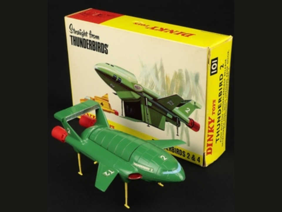The Dinky Toys model 101 Thunderbird 2 with its tiny Thunderbird 4 submarine taps straight into childhood memories of science fiction television. This toy pairs a chunky green rescue aircraft with a removable pod and a small yellow sub that slides out on a ramp. Kids loved the moving parts, opening doors, and bright markings, which means many toys saw plenty of playtime and ended up chipped or missing pieces. Dinky offered variations with different pod door numbers and base markings, and serious fans track those little changes closely.