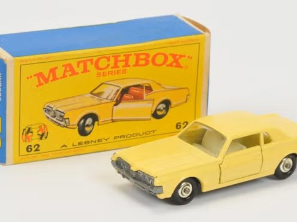 The 1968 Regular Wheels 62c Mercury Cougar in pale yellow shows how a simple color change can turn a small toy into a huge prize. Matchbox shifted the model to lime green fairly quickly, which left a short early run in soft yellow paint. The pale shade pairs with clear windows that lack wipers and a missing rearview mirror inside, small details that help experts confirm it is an untouched first casting.