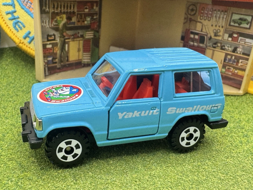 The Mitsubishi Pajero in Yakult Swallows baseball team colors blends sports culture and off road style in one little truck. This special Tomica release carries team logos and bright side graphics, and it was never as widely distributed as regular catalog Pajeros. Collectors like how it stands out in a display full of ordinary police cars and taxis because the livery tells a very specific story.