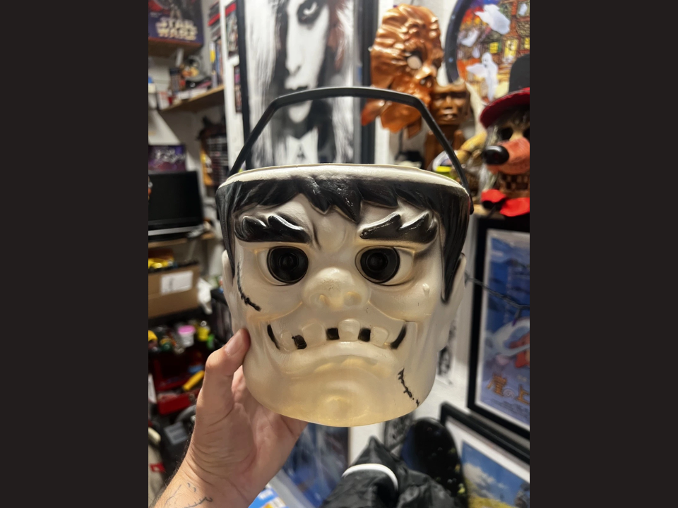 Produced by Remco in the 1960s, the Frankenstein’s Monster Plastic Bucket is a standout piece for collectors of vintage Halloween memorabilia. The bucket features a striking green face with exaggerated bolts, offering a fun yet spooky design. This particular model was marketed alongside a popular series of Halloween-themed toys and was especially popular with young trick-or-treaters.