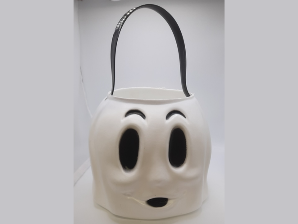 The Empire Plastic company produced a series of hard plastic trick-or-treat buckets in the 1950s and 1960s, and the ghost design is one of the most iconic. This bucket features a simple, yet charming ghost face, with the classic black and white color scheme. The bucket was part of a larger collection of whimsical Halloween designs that also included pumpkins, witches, and monsters. Its timeless design continues to captivate collectors today.