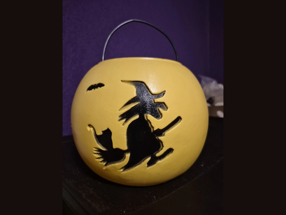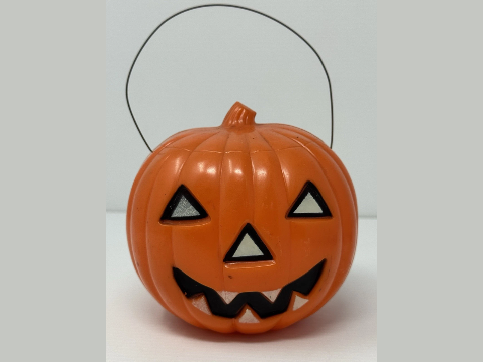Union Products, known for producing iconic Halloween decorations, released a plastic pumpkin bucket in the 1950s. This pumpkin bucket is noted for its smooth surface and simple, traditional jack-o’-lantern face. Unlike the more commonly found design, this particular version features a distinct, rounded shape and a sturdy handle, which was a key selling point in its time.