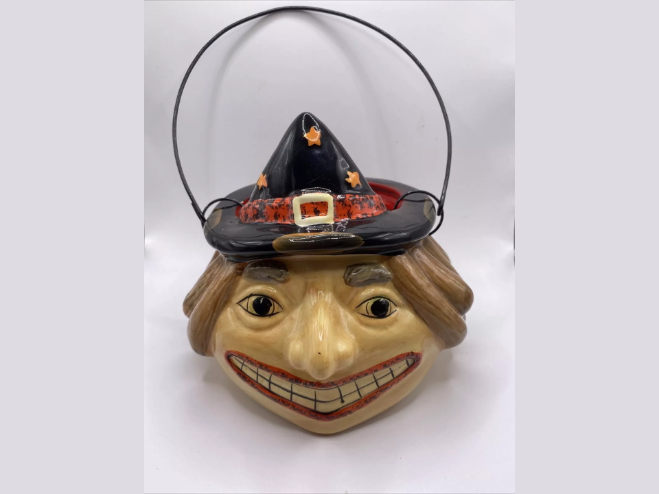 This hanging ceramic witch bucket is valued between $100 and $175, depending on its condition and rarity. The high-quality craftsmanship and nostalgic appeal of the item make it an attractive choice for collectors of vintage Halloween décor. Its ability to serve both as a functional item and a decorative piece only adds to its lasting appeal.
