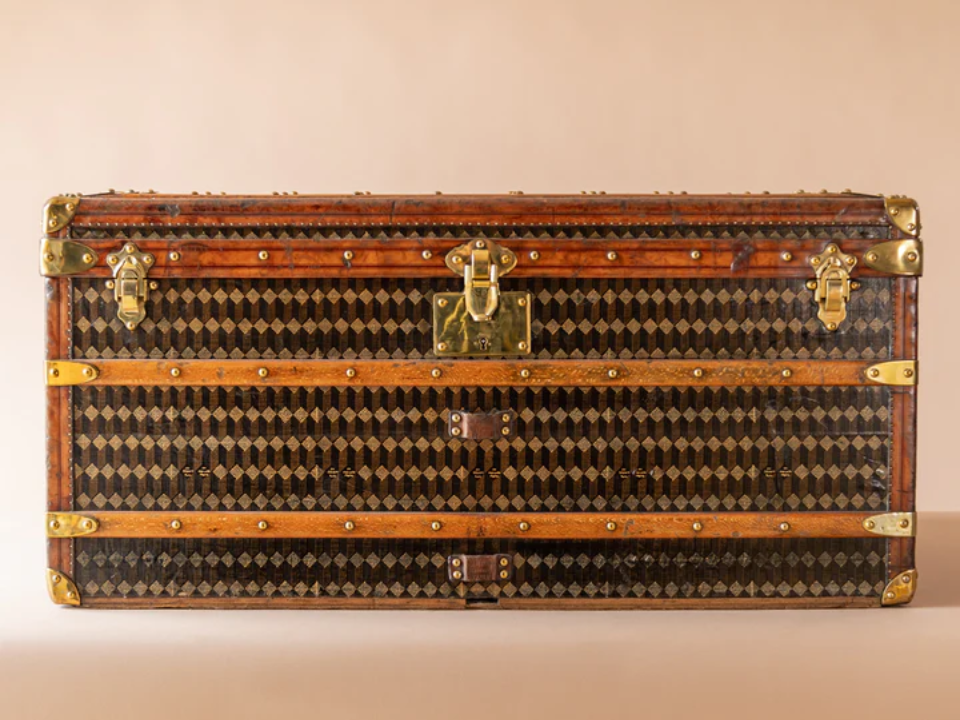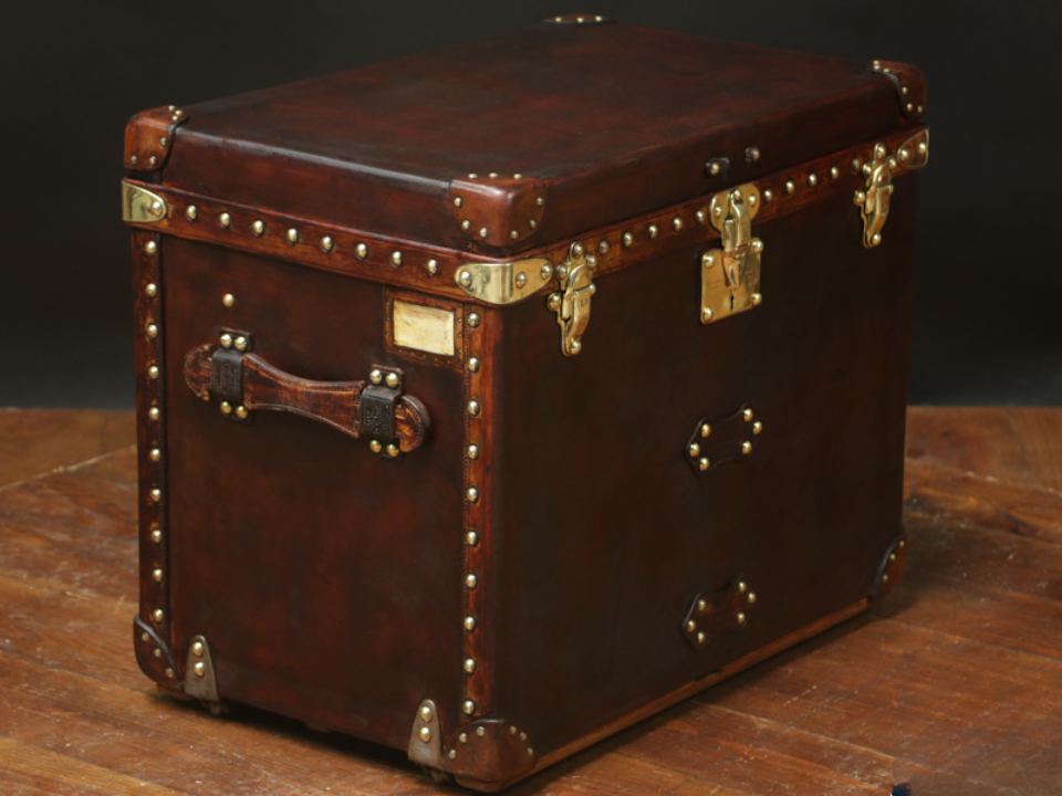 Far less common than the monogram canvas versions, the all-leather Louis Vuitton trunk has a richer surface and a warmer tone. These pieces were made by Louis Vuitton in France in the early 1900s, and listings point to leather bodies with brass fittings. A present-day asking figure of about $25,800 is typical for a notable example. The leather finish gives it a more furniture-like look from the start.