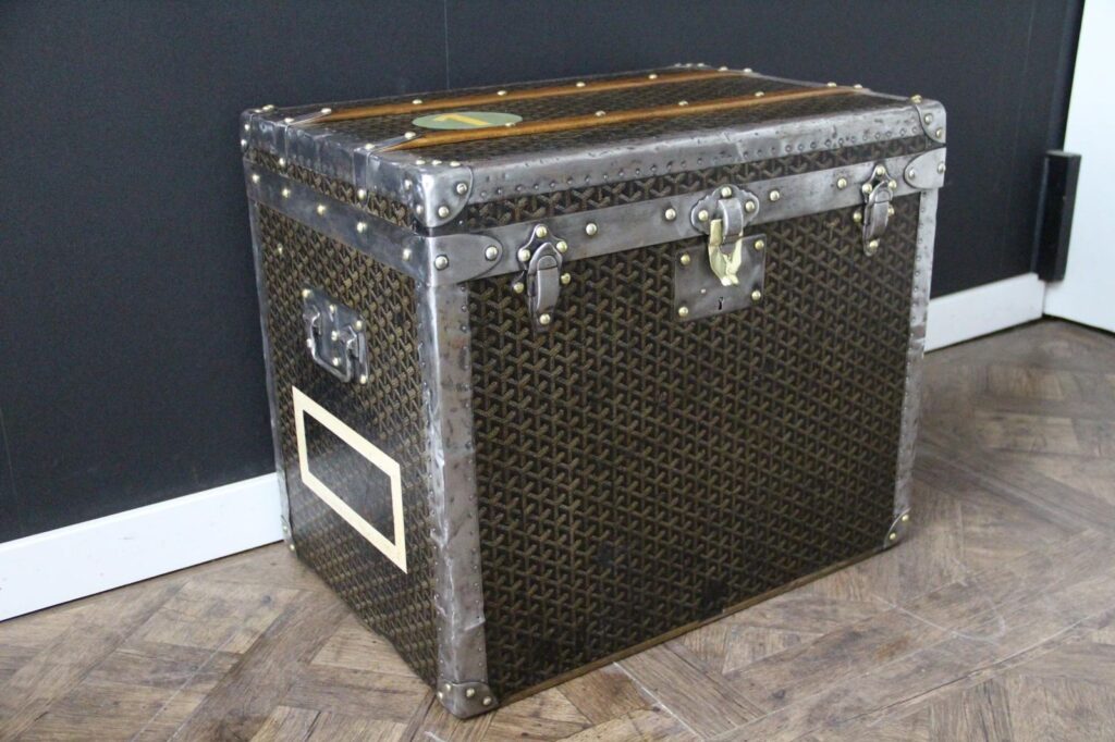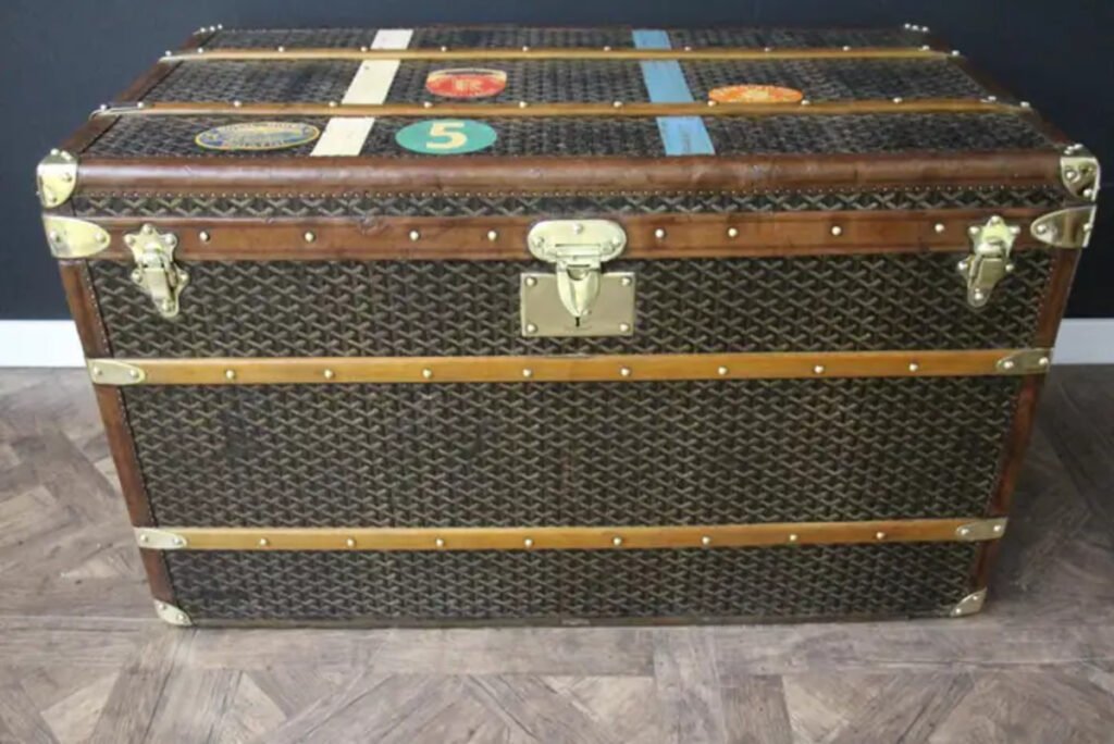 The Goyard courrier trunk is one of the strongest French alternatives to Louis Vuitton. Most examples on the market date from the 1920s, and they were produced by Goyard in France with chevron canvas and solid brass fittings. Present dealer prices often fall around $19,400 to $25,500, depending on size and finish. The chevron pattern gives it a quieter look than the monogram canvas, though it still reads as luxury luggage.
