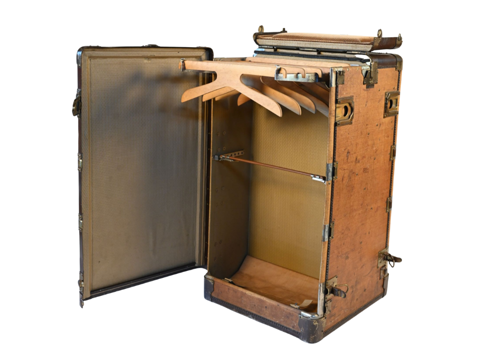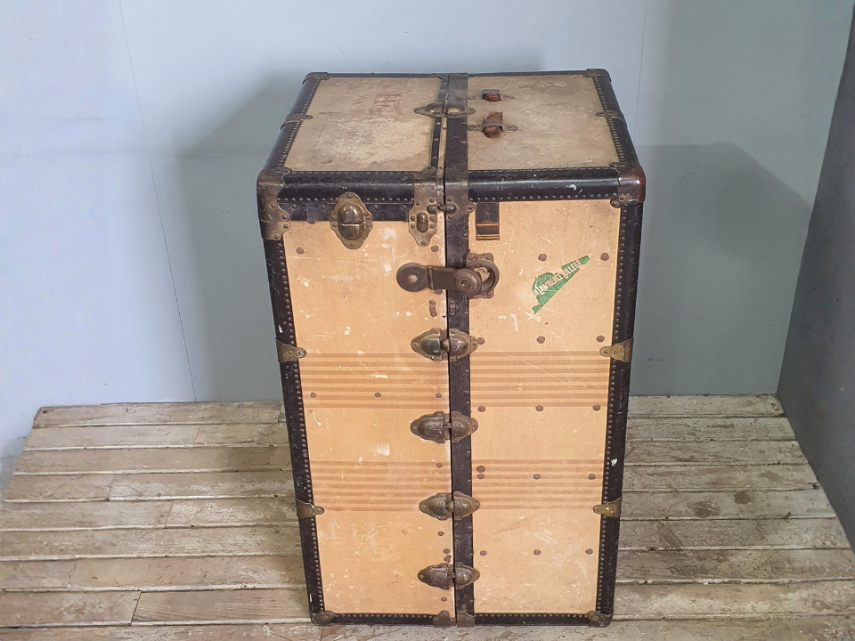 Inside, this type opens more like a compact closet than a plain trunk. Collectors like the height, the useful storage sections, and the way it can stand in a room like a cabinet. Original trays, hanging sections, labels, and working locks usually matter a lot when value is judged. In a bedroom or study, it can work as both storage and a strong period statement piece.
