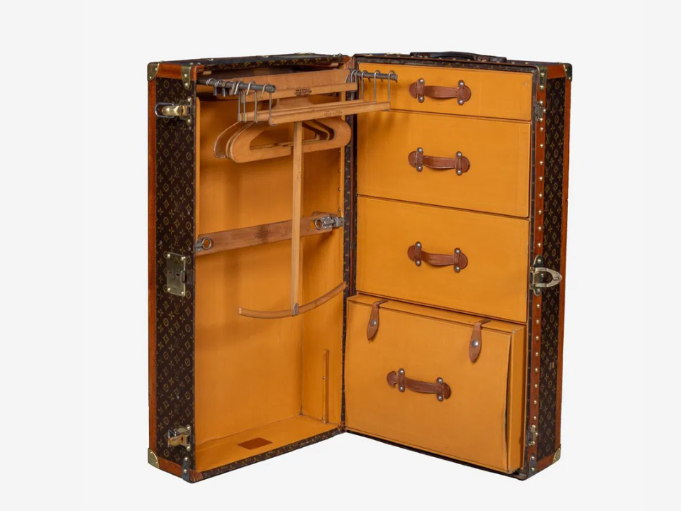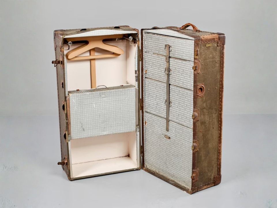 Among early luxury trunks, the Louis Vuitton wardrobe trunk stands near the top for decor and resale value. Most examples date from the 1910s through the 1930s, and the maker was Louis Vuitton of France. These trunks usually feature a monogram canvas outer shell with brass fittings and a fitted wardrobe-style interior. A present-day dealer’s range of about $27,600 to $34,300 is common for notable examples, especially when the body stays crisp, and the inside fittings are still there.