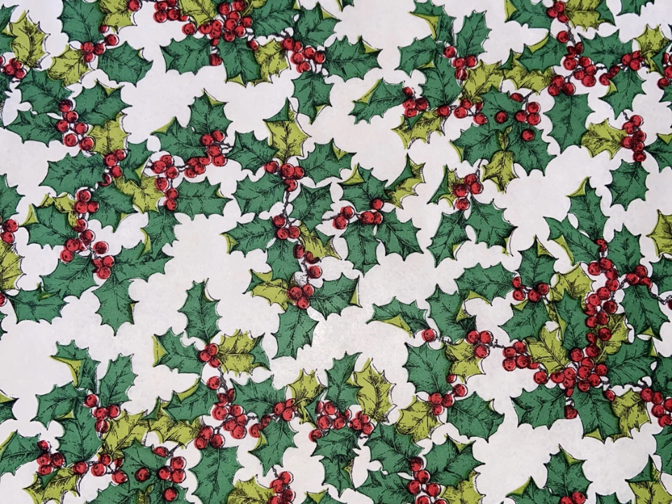 The Holly and Berries wrapping paper from the 1930s represents the elegance of early 20th-century holiday designs. It features bright red holly berries against a dark green background, accented with gold foil highlights. The clean lines and simple yet festive design make this paper highly collectible. This vintage wrapping paper was common in the 1930s, but due to its fragile nature, it is hard to find in good condition today.