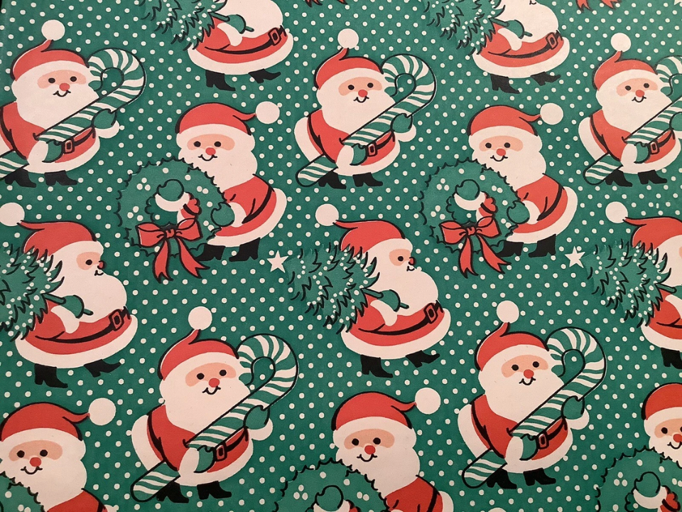 A beloved design from the 1940s, this wrapping paper features a jolly Santa Claus surrounded by delicate snowflakes. The cheerful imagery and use of bold colors like red and green make this wrapping paper an iconic symbol of the holiday season during that era. This paper was popular for its combination of whimsy and warmth, making it a standout choice for holiday presents.
