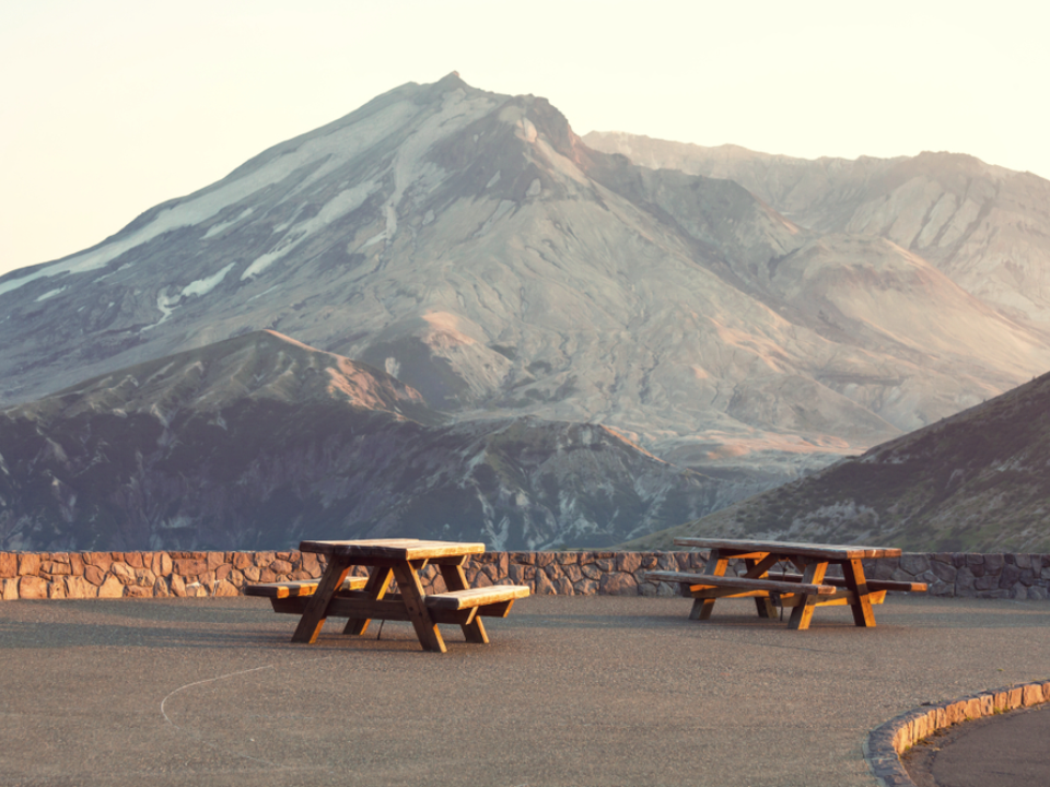 Mount St. Helens is a famous active volcano located in Washington State, known for its catastrophic eruption in 1980. The landscape around the volcano is a mix of volcanic debris, barren slopes, and new growth from the forest that is slowly reclaiming the land. The cool, crisp air at the summit adds to the atmosphere of this volcanic wonder.