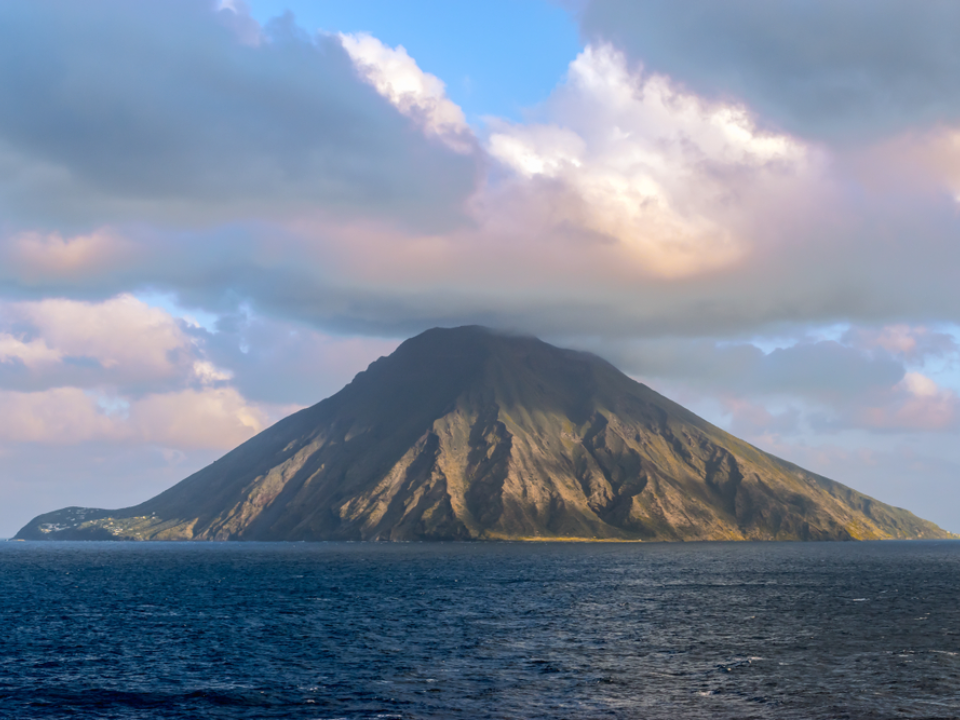 Mount Stromboli is a small, active island volcano located off the coast of Sicily. The volcano is known for its constant, gentle eruptions, which send plumes of smoke and ash into the air. The cool breeze at the summit contrasts with the heat generated by the volcanic activity below, adding to the otherworldly feel of the location.