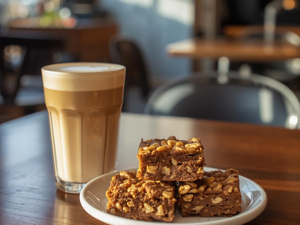 For the blondies, mix half cup melted butter, 1 cup brown sugar, 1 egg, 1 teaspoon vanilla, 1 cup flour, and half cup chopped walnuts. Bake at 350°F for 25 minutes until set. For the latte, brew half cup strong coffee and heat 1 cup milk. Stir in 2 tablespoons maple syrup and combine with the coffee. Serve hot. Let blondies cool slightly before slicing.